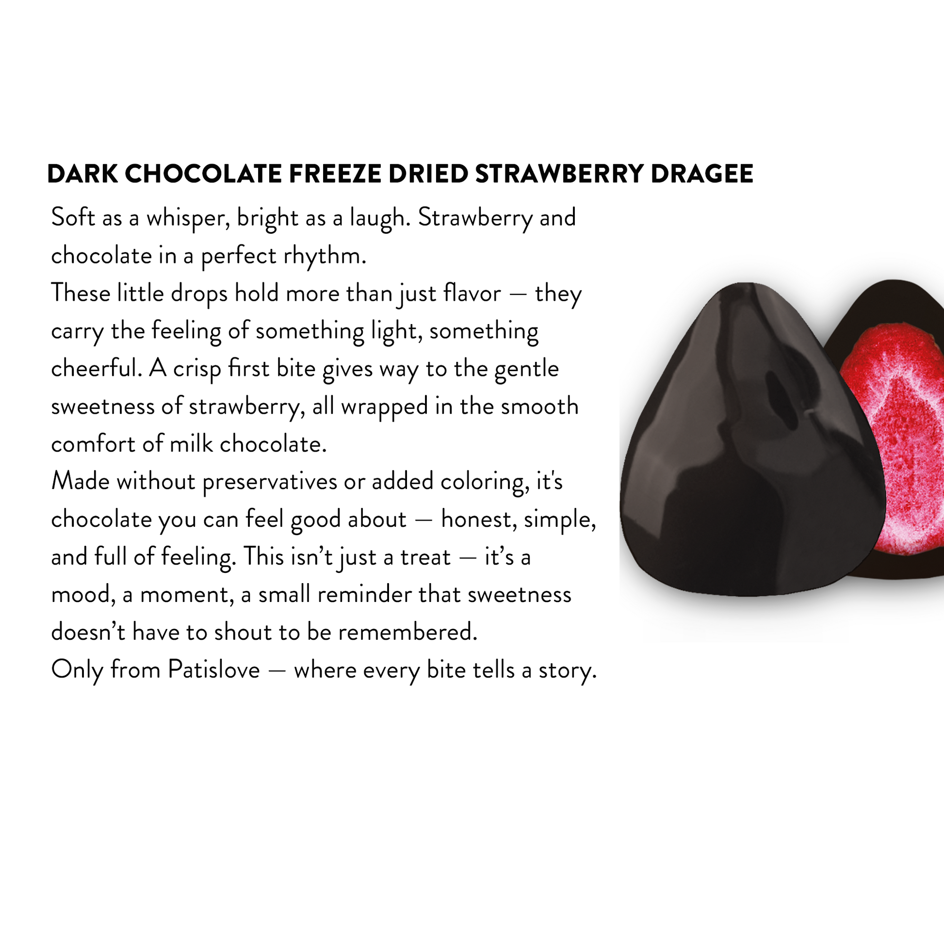Erlebe die perfekte Balance aus Knusprigkeit und Genuss mit den PatisLove Freeze-Dried Strawberry Dragees. Ganze gefriertrocknete Erdbeeren werden mit edler 57 % Zartbitterschokolade umhuellt und bieten ein intensives, fruchtig-herbes Geschmackserlebnis.