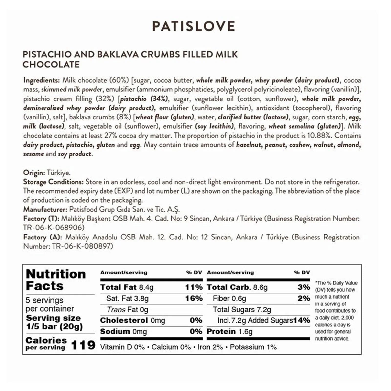 Pistachio Cream and Baklava Crumbs Filled Milk Chocolate, 100G